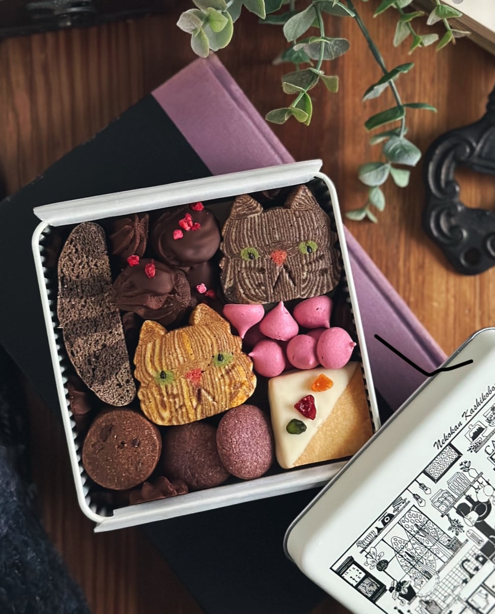 よく探すとイラストにネコちゃんが隠れてる、オリジナルイラスト缶に詰めてお届け致します。