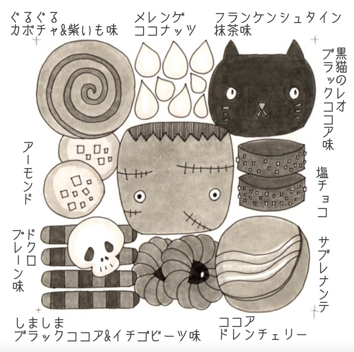 小麦粉(国産)、砂糖、きび砂糖、バター、塩、卵、アーモンドパウダー、アーモンドダイス、ドレンチェリー、コーンスターチ、ココナッツ、ココア、ブラックココア、みりん、水飴、牛乳、抹茶、、イチゴパウダー、ビーツパウダー、紫芋パウダー、カボチャパウダー、胡麻