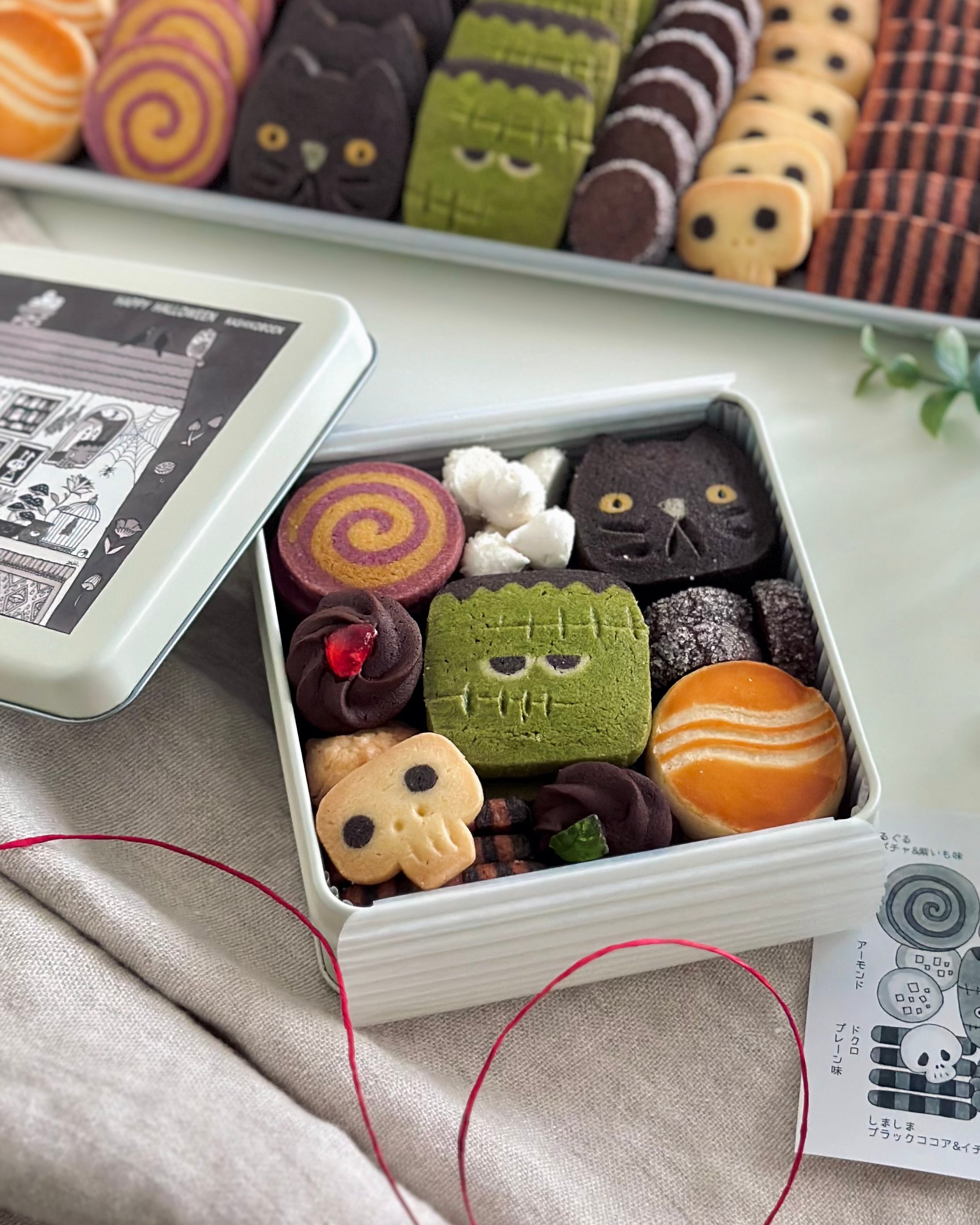 黒猫のレオ、フランケンシュタイン、ドクロが賑やかなハロウィンクッキー缶です。